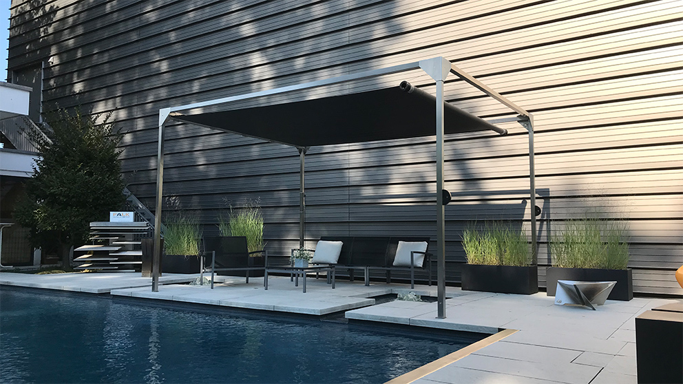 Das SHADE verbindet die elegante und leichte Ausführung eines Sonnensegels mit den Vorteilen eines aufwendigen Markisensystems.
